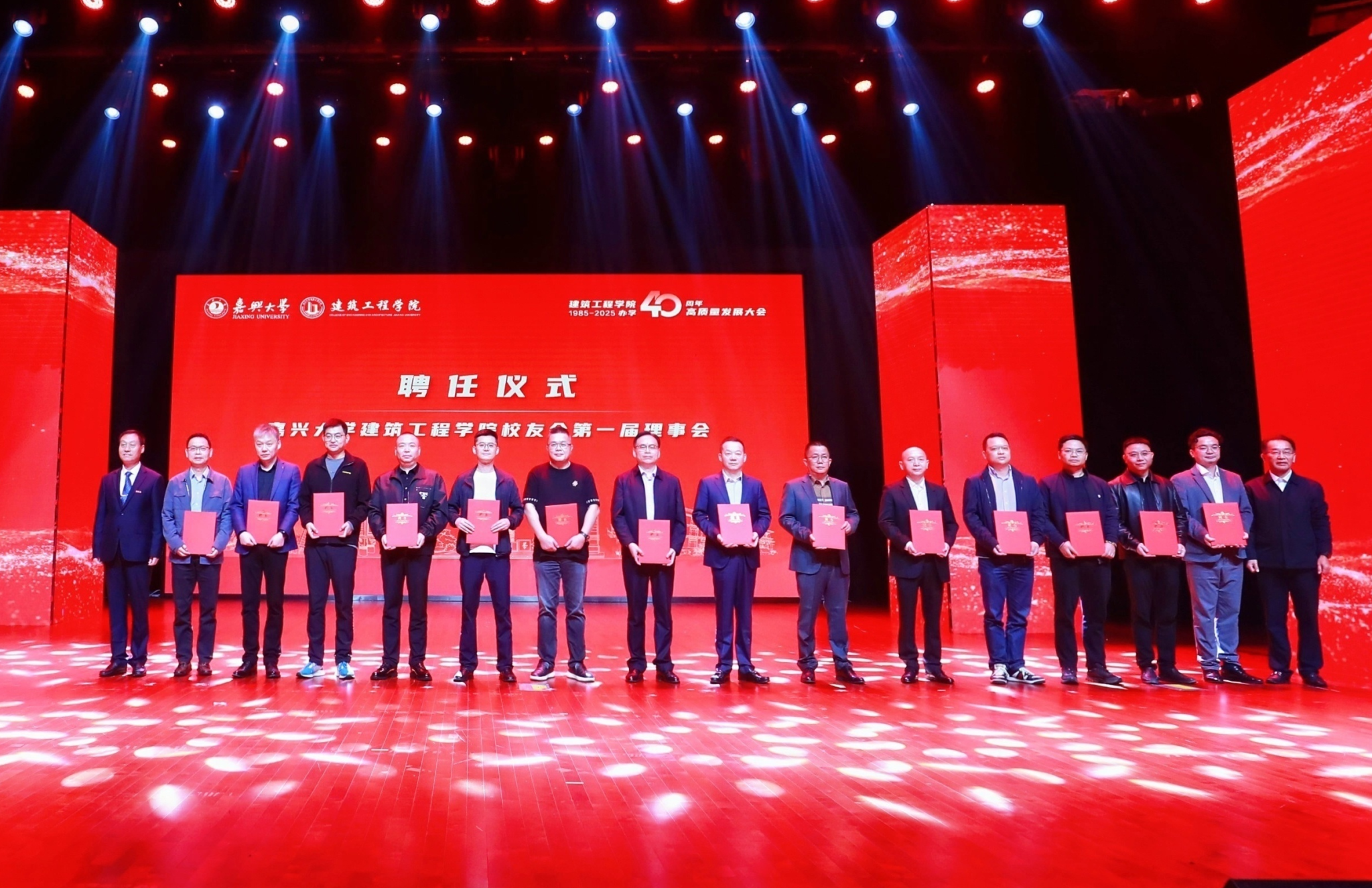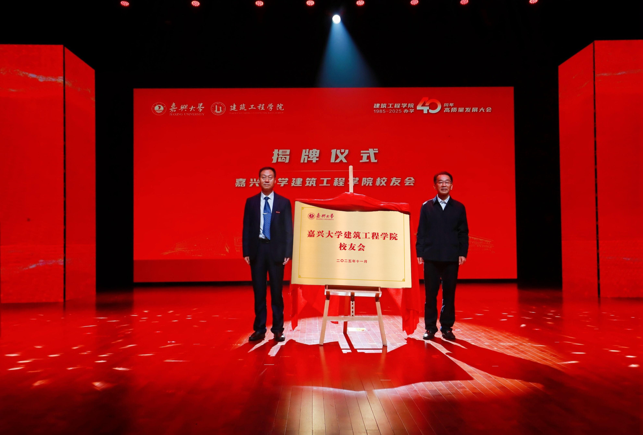 大会现场,社会合作处处长、校友办主任丁玉泉和建筑工程学院院长王恩茂共同为“嘉兴大学建筑工程学院校友会”揭牌,并为学院校友会第一届理事会成员代表颁发聘书。