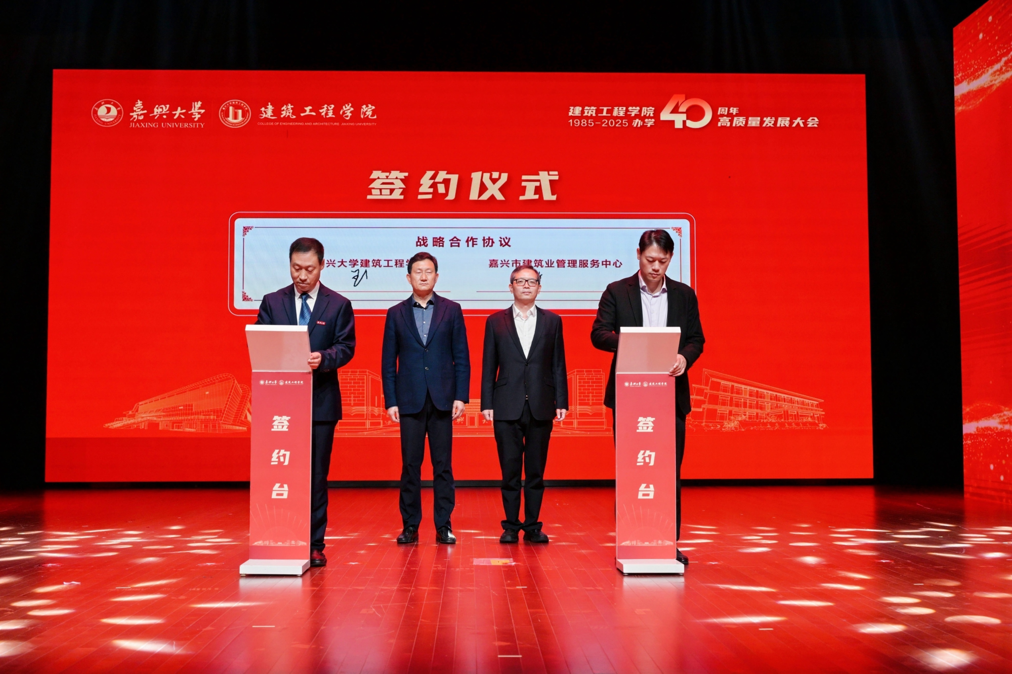 在嘉兴大学副校长周宏伟、嘉兴市住房和城乡建设局副局长朱斌的见证下,嘉兴市建筑业管理服务中心主任陈丽锋和建筑工程学院院长王恩茂代表双方签订战略合作协议。