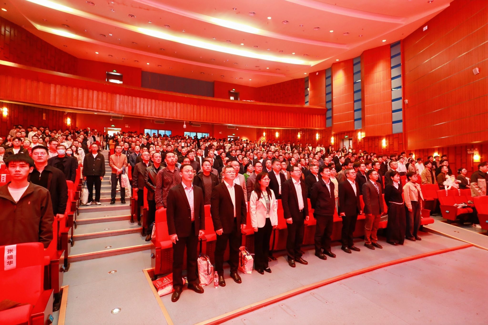 大会伊始,现场全体人员肃立,面向国旗,奏唱国歌,激昂的旋律回荡在会场。