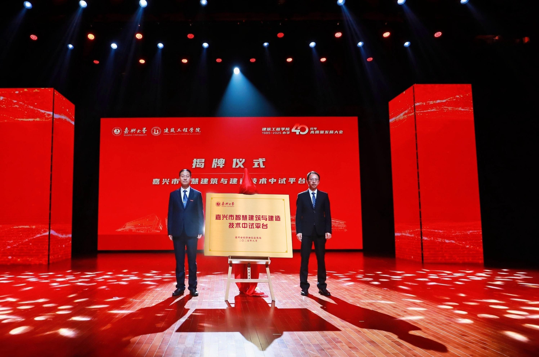 嘉兴大学科技处处长张景军和院长王恩茂共同为“嘉兴市智慧建筑与建造技术中试平台”正式揭牌,标志着学院在服务区域经济社会发展方面迈出重要一步。