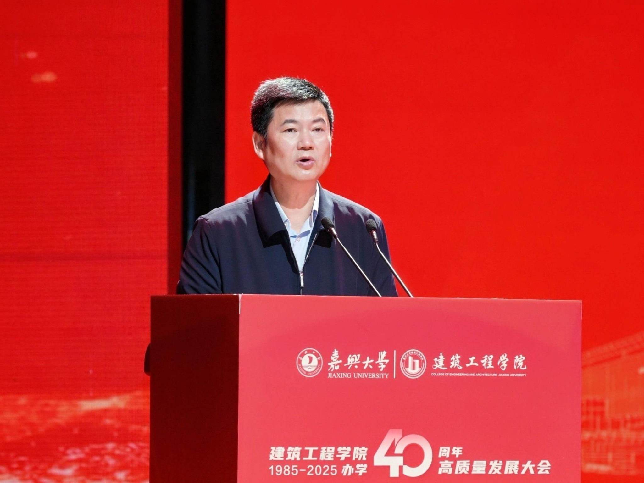 嘉兴大学党委书记沈希为大会致辞。他代表学校向长期以来关心和支持建筑工程学院建设与发展的各级领导、社会各界朋友、广大校友及辛勤耕耘在教育科研一线的全体教职员工致以敬意。他深情回顾,1985年,为满足地方经济建设对专业人才的迫切需求,原嘉兴高等专科学校土木工程系应运而生,自此踏上了服务嘉兴乃至全国城乡建设事业的征程。2000年,乘着高等教育管理体制改革的东风,嘉兴高专和浙江经专合并,土木工程系整合资源、凝聚力量,实现了从单一学科向多学科学院的历史性跨越,成为嘉兴大学服务经济社会发展的重要支柱。40年来,一代代建工人以服务国家建设需求为己任,以培育卓越工程人才为根本,在城乡建设、重大工程、产业升级等领域贡献智慧,用实干实绩诠释了“嘉大建工”的深厚底蕴与时代价值。