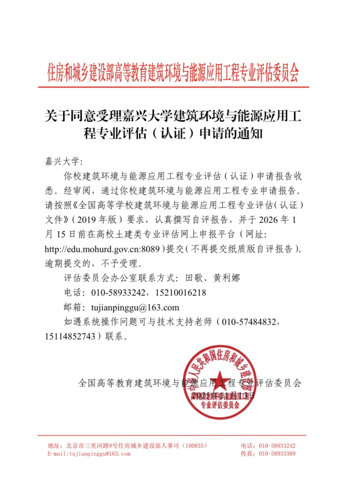 11月14日,住房与城乡建设部高等教育建筑环境与能源应用工程专业评估委员会下发《关于同意受理嘉兴大学建筑环境与能源应用工程专业评估(认证)申请的通知》,通过我院建筑环境与能源应用工程专业申请报告。