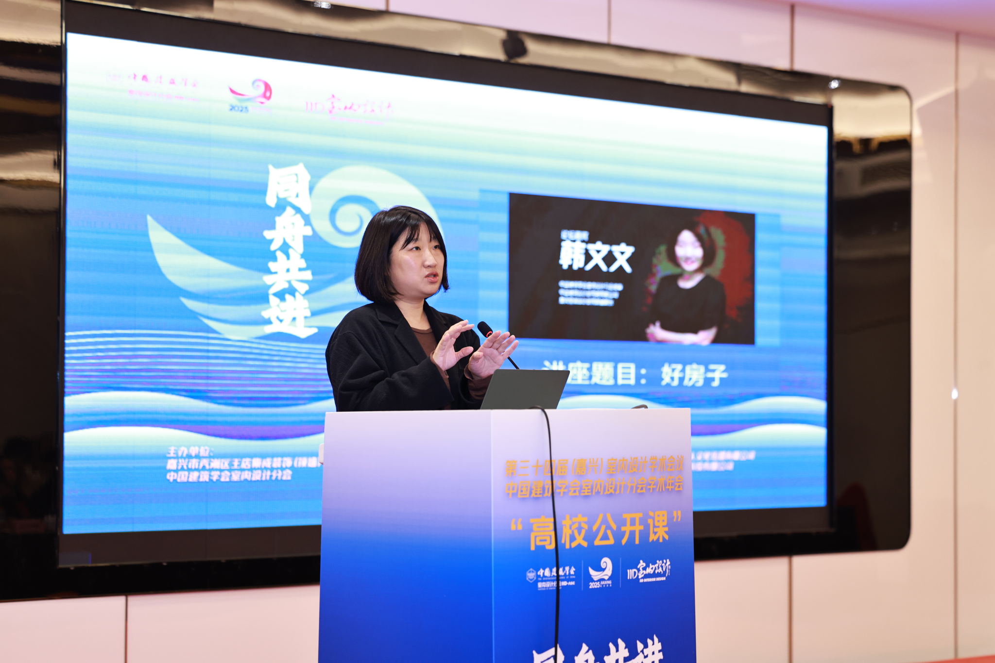 中国建筑学会室内设计分会理事、中国建筑设计研究院有限公司室内空间设计研究院副院长韩文文,带来题为《好房子》的精彩分享。她提出绿色设计是兼具技术属性与价值判断的价值观,阐述了设计理性回归对平衡空间美学属性与资源消耗的重要意义,为量大面广的社会性公共建筑室内设计提供了可借鉴的实践路径。