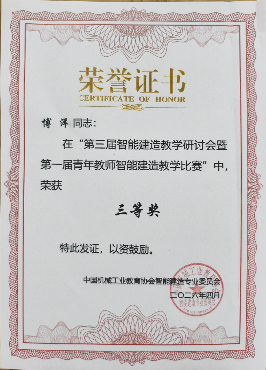 在第一届青年教师智能建造教学比赛中,我校青年教师博洋老师的“装配式建筑的“精益基因”——DMFA设计与模块化施工”,获得三等奖。