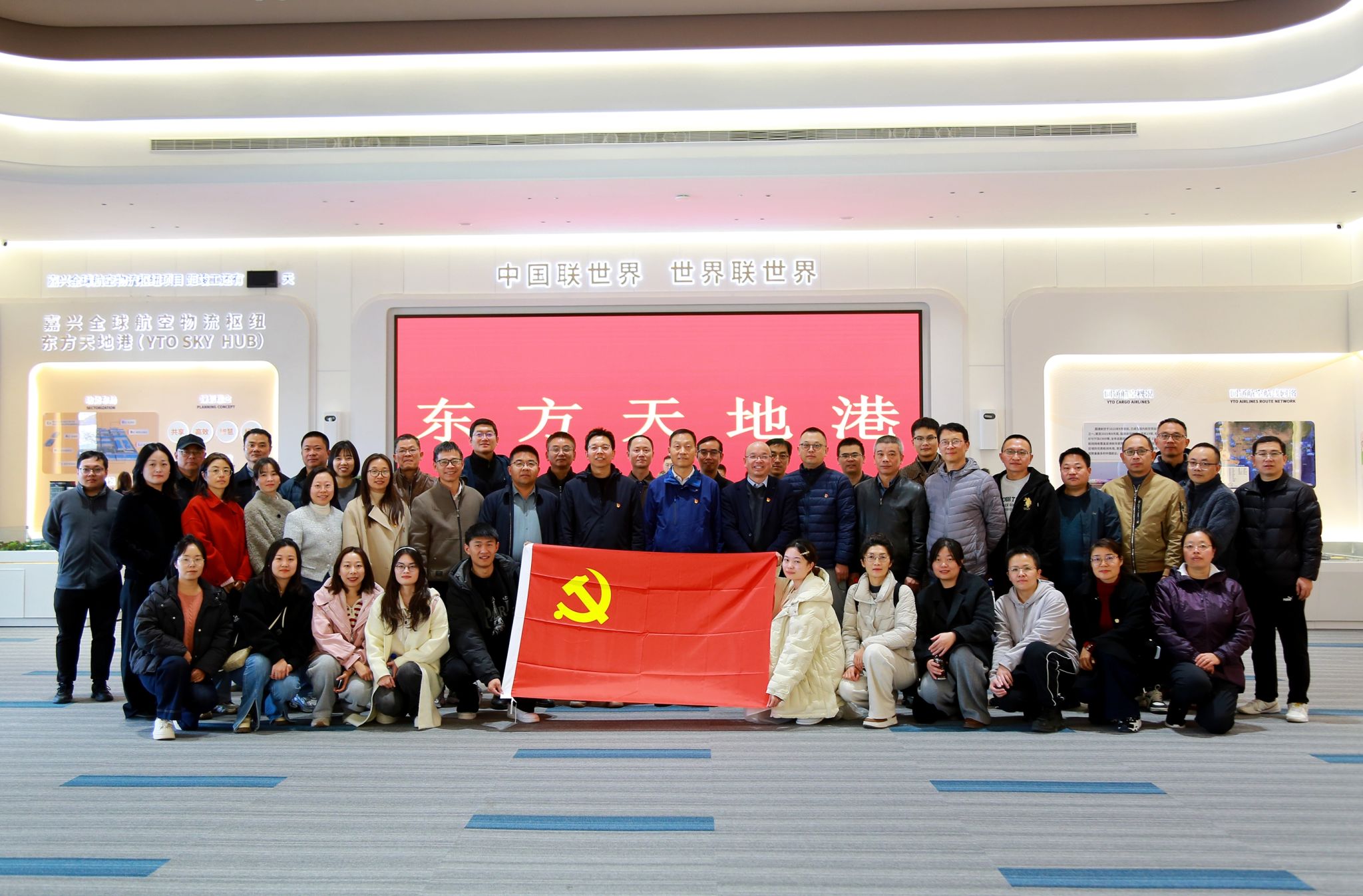 在学院党委书记童勇军、院长王恩茂等党政领导班子成员的带领下,党员们首先来到圆通东方天地港项目现场。这里是浙江省重点工程,也是全球瞩目的航空物流枢纽。党员们重点参观了圆通物流园、进口商品交易区以及正在紧锣密鼓施工的货物进口和出港海关节点。据现场负责人介绍,目前东方天地港正处于施工收尾与设备调试的关键阶段,多个单体建筑已进入最后冲刺期。